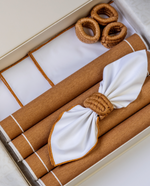 (Set of 4) This set includes Classic Caramel Placemat, Linea Caramel Napkin and Beige Naronha Napkin Ring.