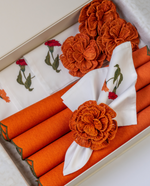 (Set of 4) This set includes Cantaloupe Placemat, Blossom Napkin and Orange Flower Napkin Ring.