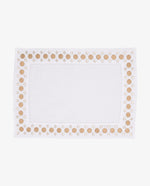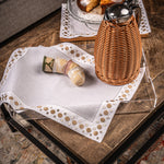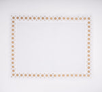 Elevate your dining experience with our hand-made Romanesque Linen Traymat. Crafted in Italy, it features an intricate gold and beige embroidered circle border, adding a touch of functional elegance to any occasion. Made with high-quality linen, it combines practicality and luxury for a truly special table setting.