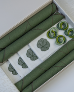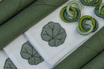 (Set of 4) This set includes 4 pieces of green colored leaf design Placemat, 4 pieces of white Napkin with green leaf embroidery, and 4 pieces of tricolor green hoops Napkin Ring.